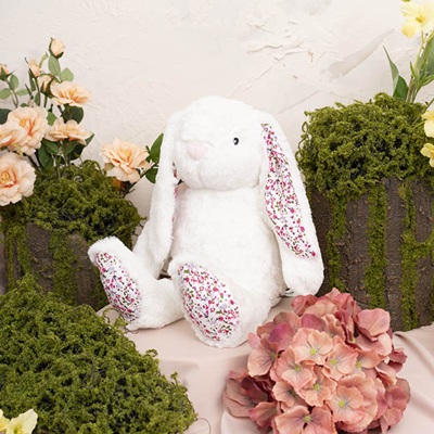 Crafted from premium plush fabric, Lucy Bunny features luxuriously soft fur, making it the perfect cuddly friend. Lucy bunny has gorgeous contrasting fabric patterns on ears and feet to coordinate with esch style